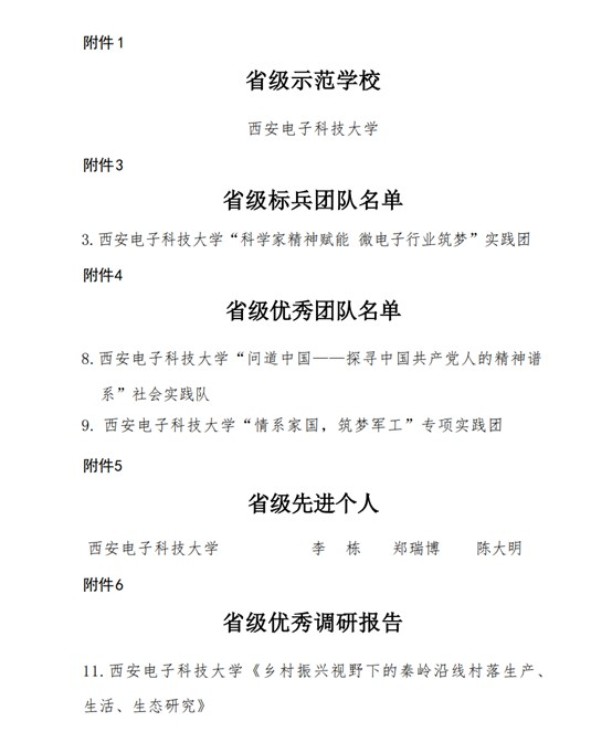西电荣获2023年“三下乡”社会实践活动省级示范学校(全省20家),微电子学院“科学家精神赋能 微电子行业筑梦”实践团荣获省级标兵团队(全省23支),校级专项“问道中国——探寻中国共产党人的精神谱系 ”社会实践队、电子工程学院“情系家国,筑梦军工”专项实践团荣获省级优秀团队,李栋、郑瑞博、陈大明获省级先进个人,通信工程学院《乡村振兴视野下的秦岭沿线村落生产、生活、生态研究》获省级优秀调研报告(全省30篇)。