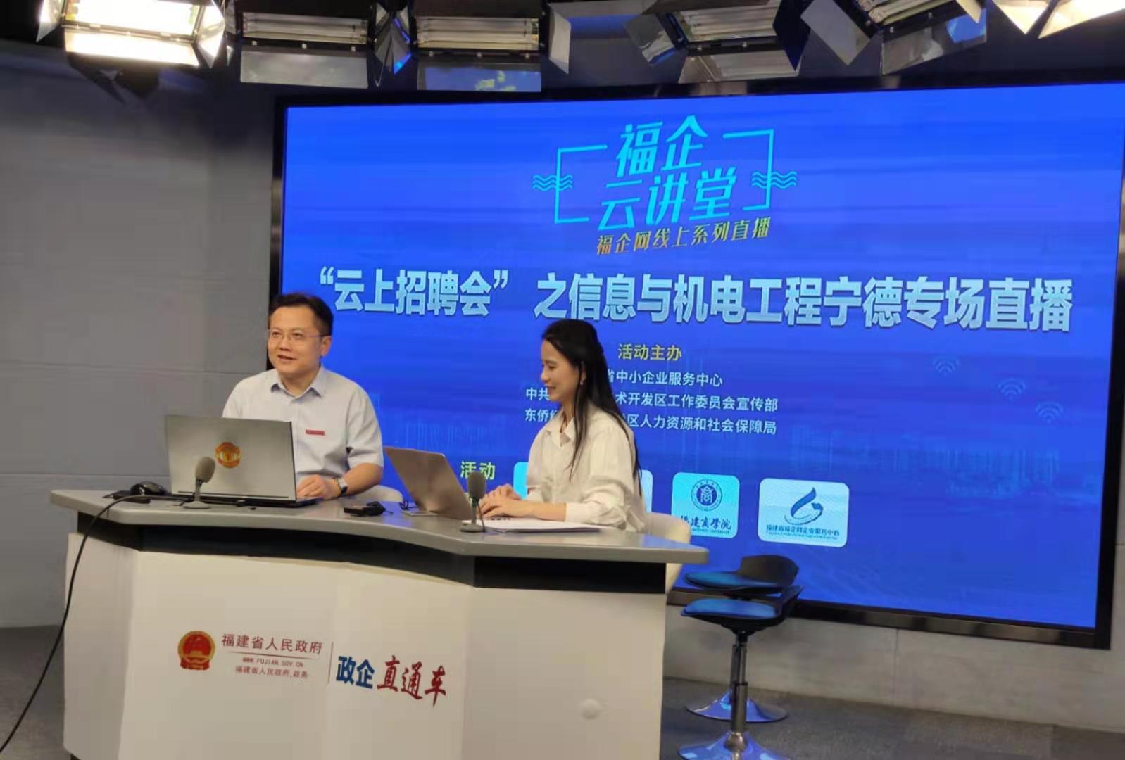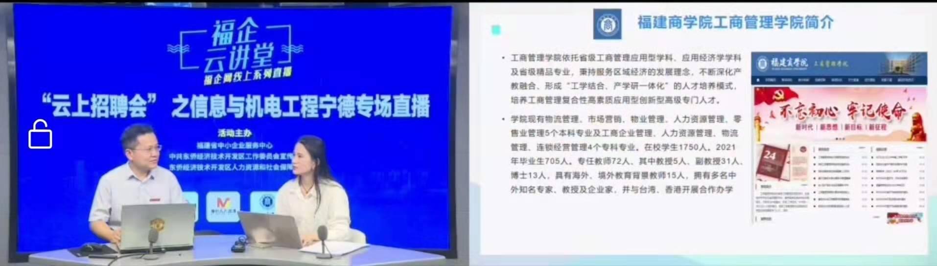2021年3月30日下午3-5点,由福建省中小企业服务中心、中共东侨经济技术开发区工作委员会宣传部、东侨经济技术开发区人力资源和社会保障局主办,由我校beat365英国官方网站、福商HR专业校友企业麦芒(福建)人力资源服务有限公司,以及福建青年人才开发中心、福建省福企网企业服务中心共同承办的福企“云讲堂”系列直播活动第十三期——“云上招聘会”之信息与机电工程宁德专场在福建中小企业服务中心直播间顺利完成播出。
