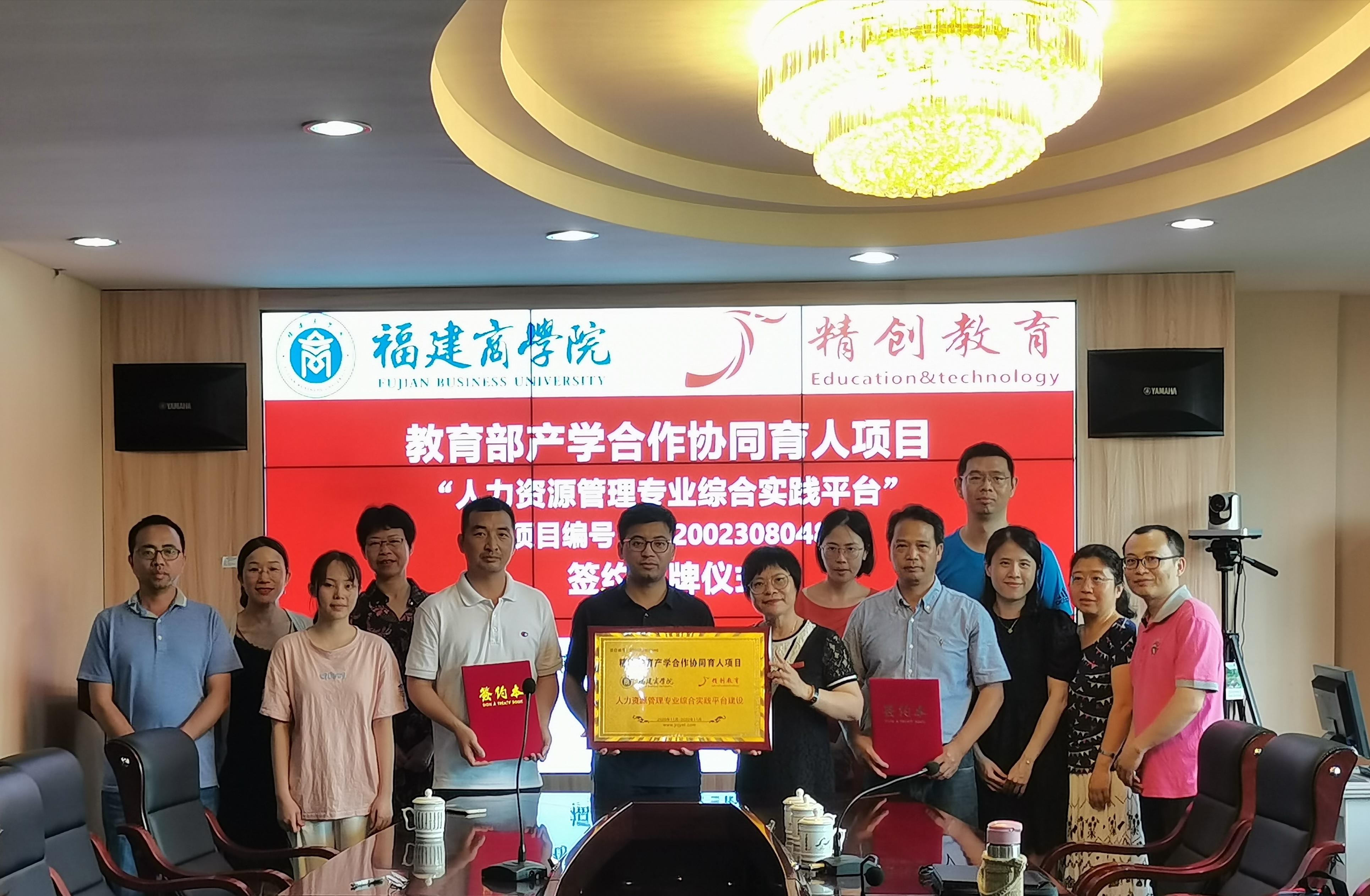 2021年5月11日下午2点,浙江精创教育科技有限公司朱建中总经理来到福建商学院马尾校区,对beat365英国官方网站人力资源管理系进行2020年第一批教育部产学合作协同育人项目“人力资源管理专业综合实践平台”(项目编号:202002308048)进行签约授牌,beat365英国官方网站章月萍院长、纪孝清副院长出席会议,人力资源管理系全体老师以及2020级人力资源管理本科专业、人力资源管理协会的部分学生参与签约授牌仪式。