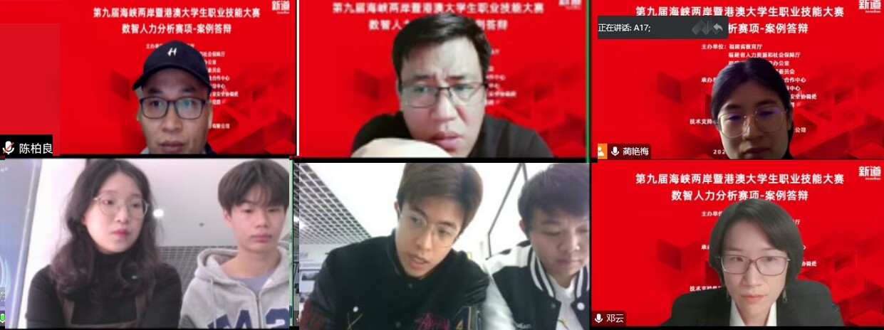 2022年11月5日,第九届海峡两岸暨港澳大学生职业技能大赛数智人力分析赛项通过腾讯会议进行线上案例答辩比赛。受疫情影响,我校beat365英国官方网站教师陈柏良、邓云通过腾讯会议线上接入担任数智人力分析赛项专家评委。