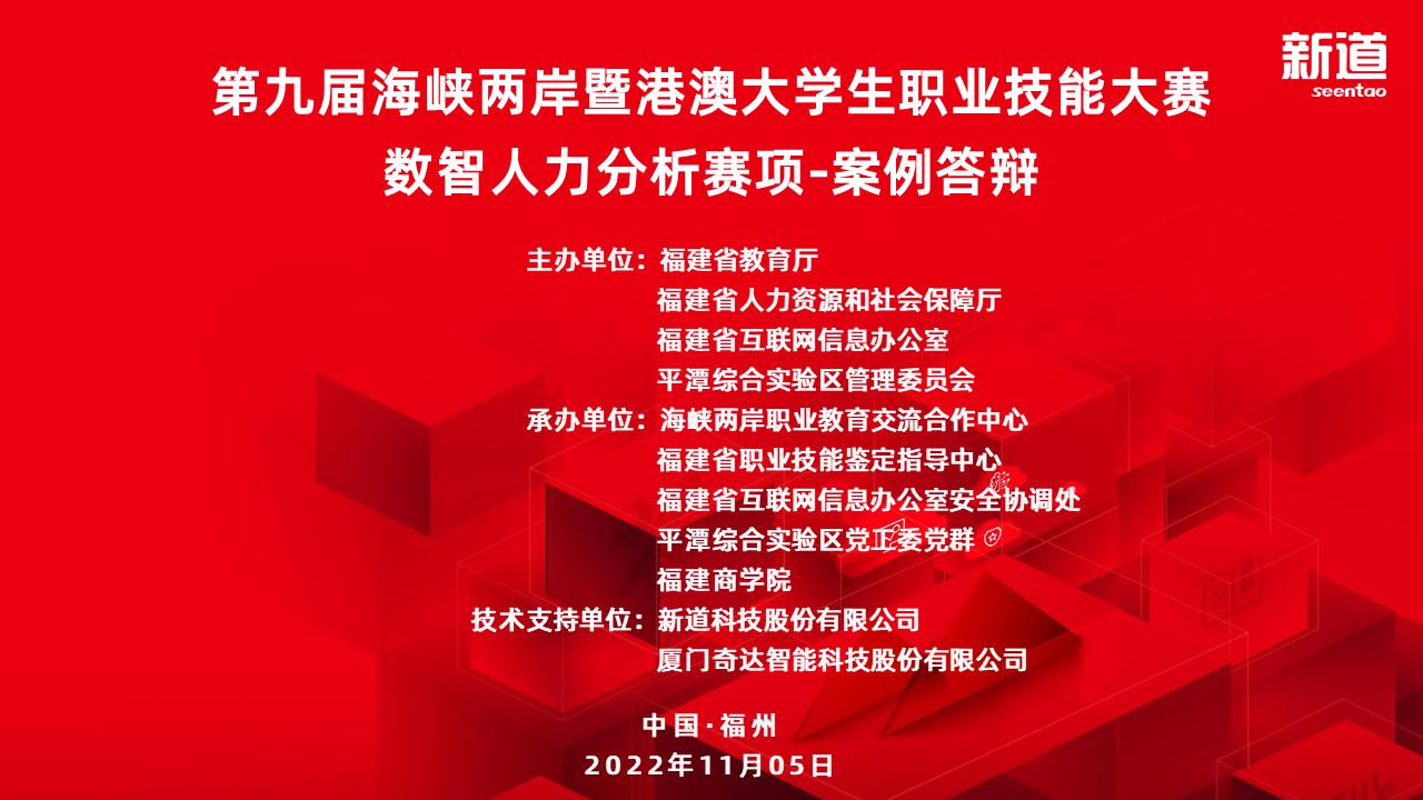 第九届海峡两岸暨港澳大学生职业技能大赛数智人力分析赛项由福建省教育厅、福建省人力资源和社会保障厅、福建省互联网信息办公室、平潭综合实验区管理委员会主办,福建商学院人力资源管理专业参与承办,新道科技股份有限公司及厦门齐达智能科技股份有限公司提供技术支持。