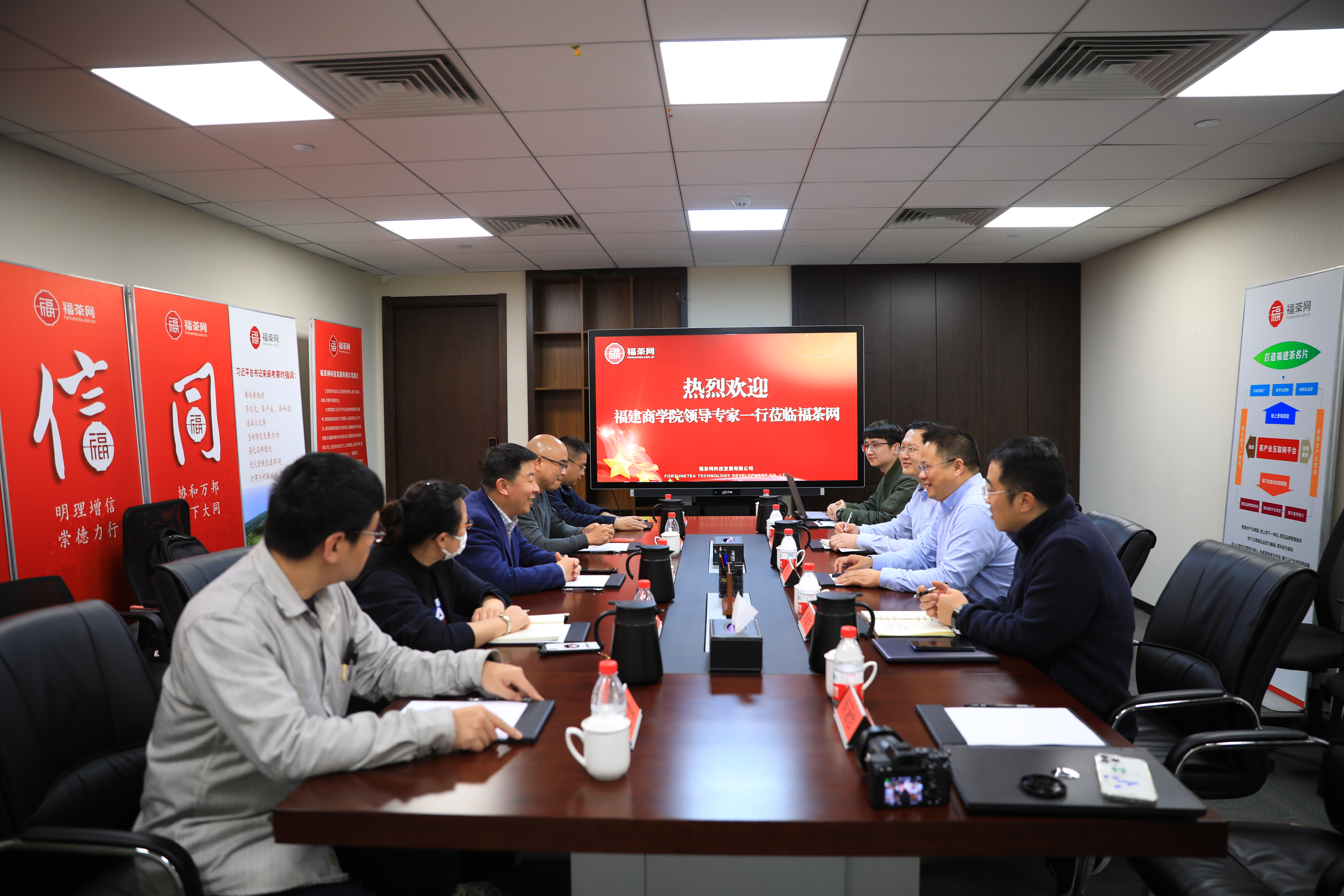 在福茶网,总经理何桂东向福建商学院到访一行人介绍了福茶网的建设历程与其肩负的“通过提供数字赋能、撮合交易、质量管控、物流配套、产业科研、金融支持、人才支撑等服务,进而实现茶叶从种植、加工、仓储、交易、物流信息全链条可追溯的综合茶产业服务平台”的使命。