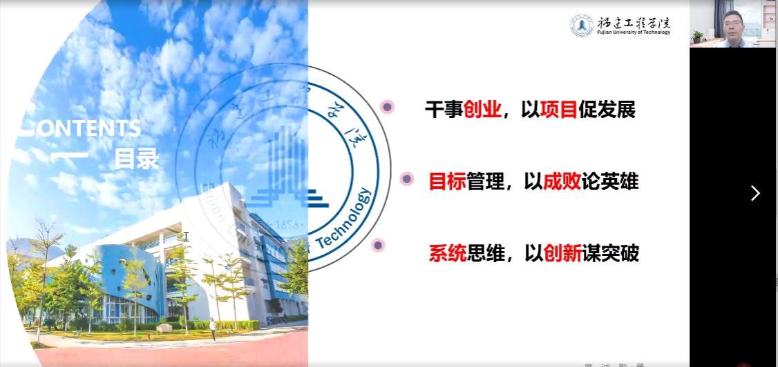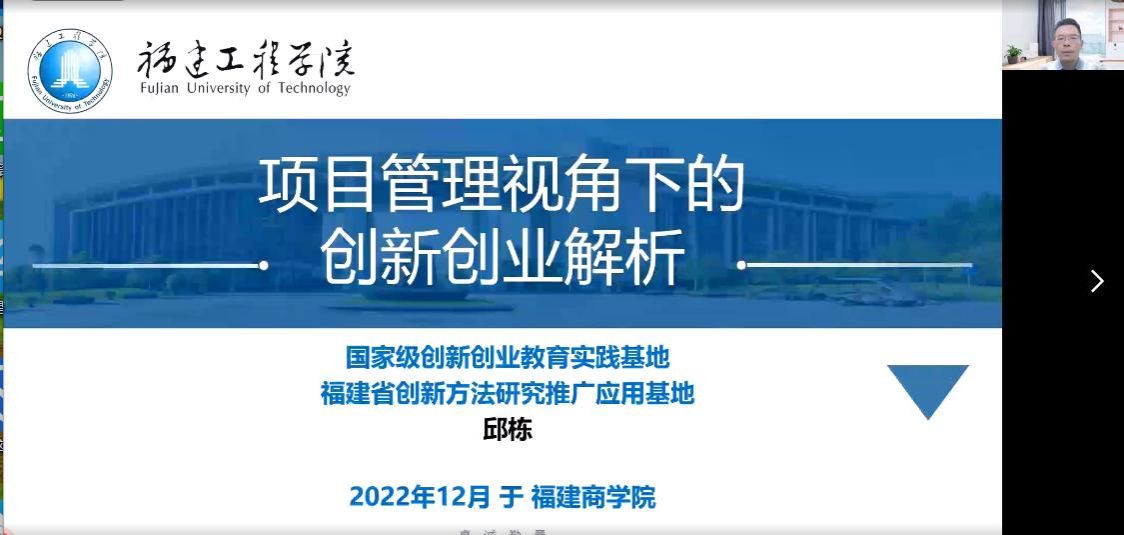 2022年12月6日,beat365工商管理系邀请福建工程学院邱栋副教授在线上开展了题为“项目管理视角下创新创业解析”的专题讲座。邱栋副教授为福建工程学院管理学院副院长、硕士生导师,福建省创新方法研究推广应用基地负责人、国家级创新创业教育实践基地骨干、国家级一流本科课程《创新思维与知识创业》骨干、中国技术经济学会复杂科学管理分会理事、国家技术创新方法与实施工具工程技术研究中心创新方法培训师。讲座由工商管理专业负责人陈颖老师主持,工商管理系150余人在线参加了本次讲座。