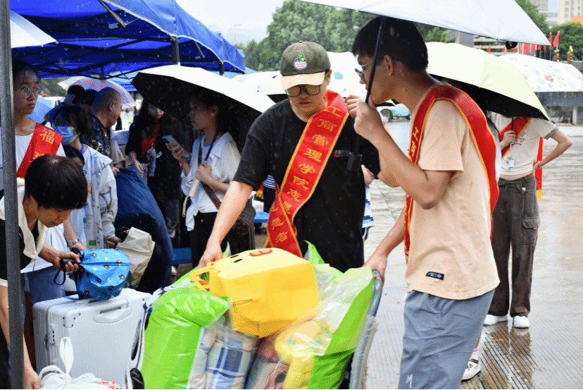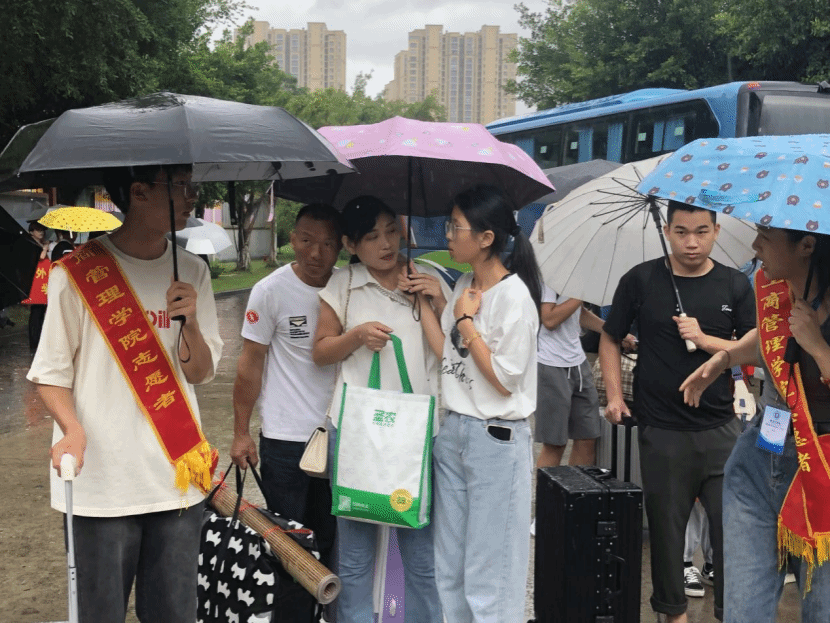 为保障迎新工作顺利开展,营造良好的入学环境,beat365英国官方网站召集各级干部、干事、志愿者以及党建人员分别在学校东南门、北门、学院系办以及学生宿舍设置多个迎新站点,为新生们提供“一站式”报到服务。在雨中,身披红色绶带的志愿者们的身影忙碌在各个校道之内,他们风雨无阻,为新生及家长们耐心细致进行入学报到流程讲解、悉心引导,让学生安心,家长放心。beat365英国官方网站志愿者们的热情细致,让初入校园的2023级工管新生们感受到beat365大家庭的温暖。