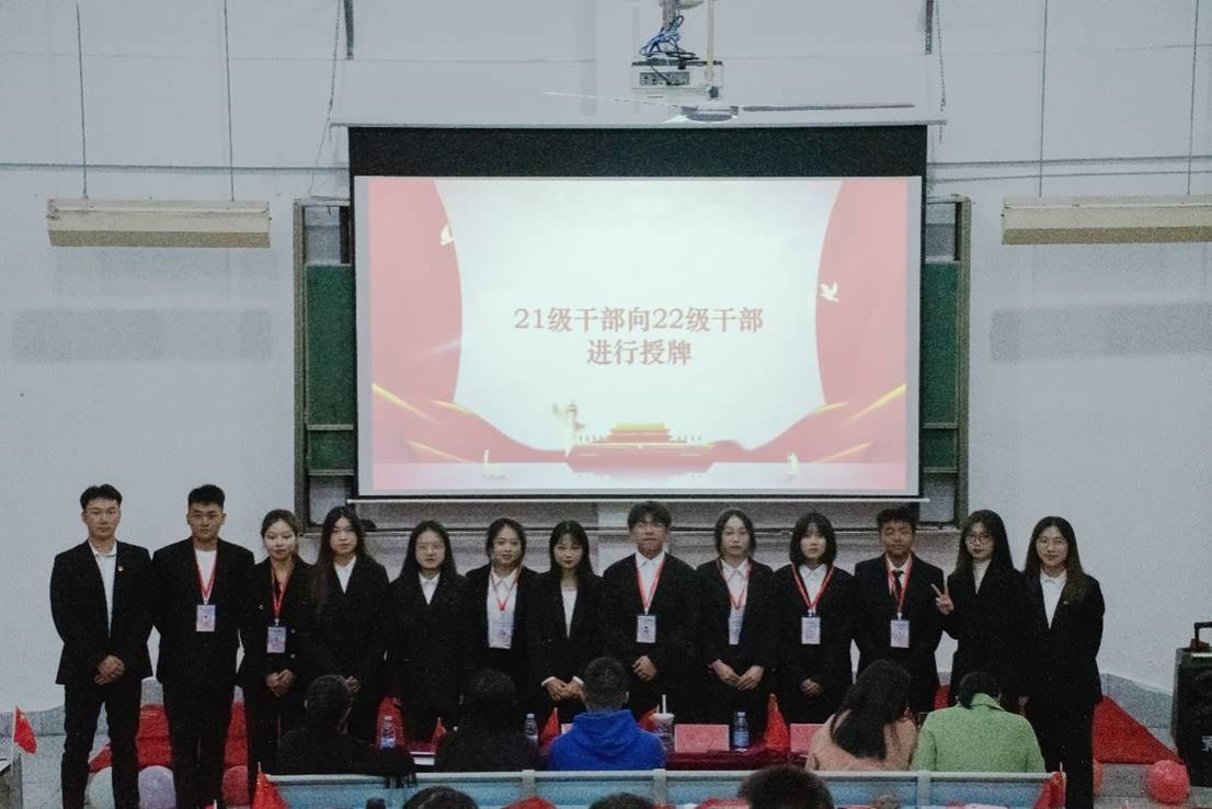 奋斗正当时,接力新征程。新老干部交接团旗,顺利完成使命的交接。由团委学生副书记叶思涵带领全体新一届学生干部面向团旗庄严宣誓。