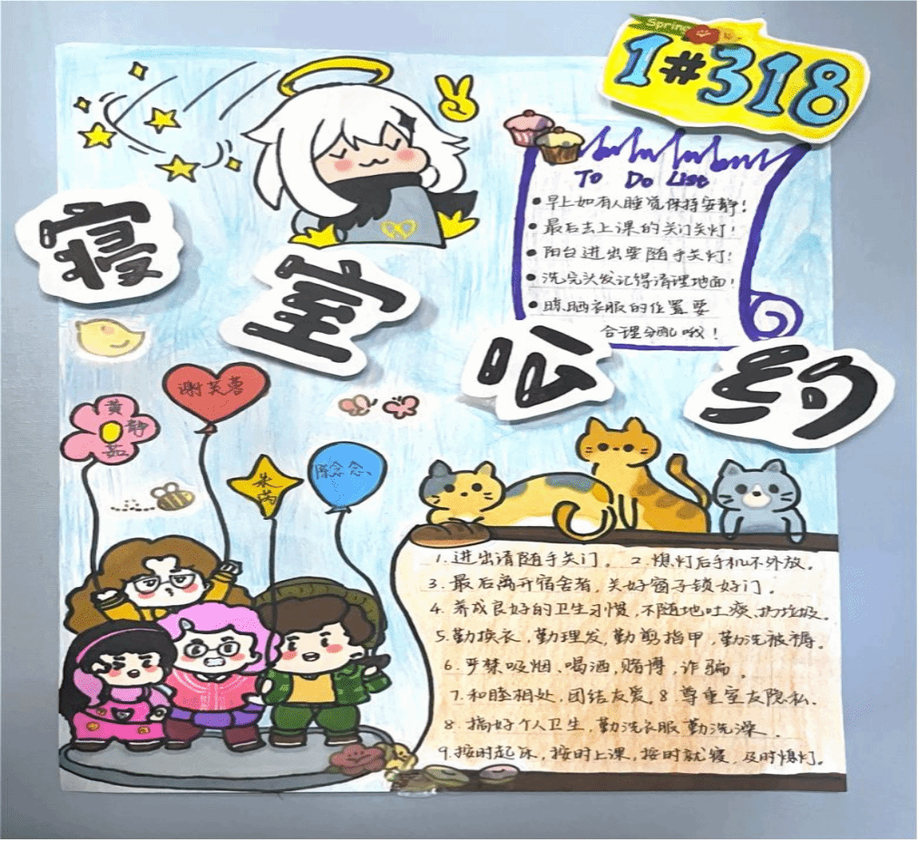 同学们设计的宿舍公约内容丰富多样,涵盖了卫生、作息、安全、人际关系等多个方面。同学们纷纷用手绘、打印的形式将寝室公约呈现出来,公约的末尾也都签上了宿舍成员的名字。这些公约体现了同学们对宿舍生活的认真思考和美好期望,也为营造良好的宿舍环境奠定了基础。优秀的宿舍公约能够全面且合理地规范宿舍生活的各个方面,具有一定的约束力和引导性。