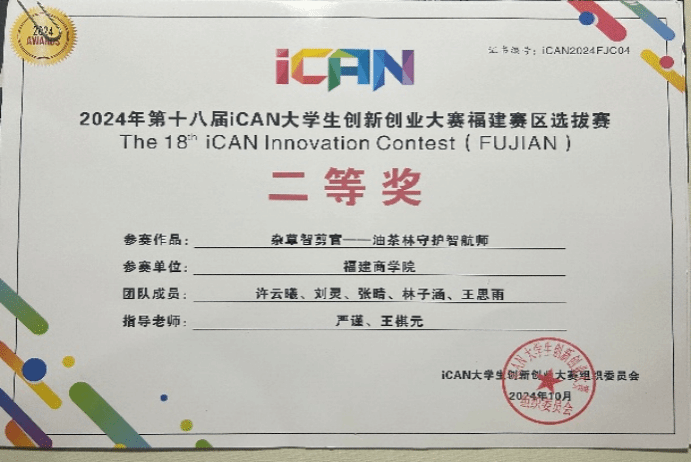 10月19日,由iCAN大学生创新创业大赛组委会、山东大学主办,厦门大学、福州大学至诚学院、福建省产教融合促进会承办的第十八届ICAN大学生创新创业大赛福建赛区选拔赛,在福州大学至诚学院成功落下帷幕,beat365英国官方网站副院长严谨教授、王棋元副书记作为指导老师,对参赛学生进行耐心、细致地指导,在机器人专家杨建华副研究员团队和福建沈郎乡、湖南大三湘、江西茶椿江的品牌支持下,beat365许云曦、刘灵等同学经过激烈的角逐,取得了福建赛区二等奖的好成绩。