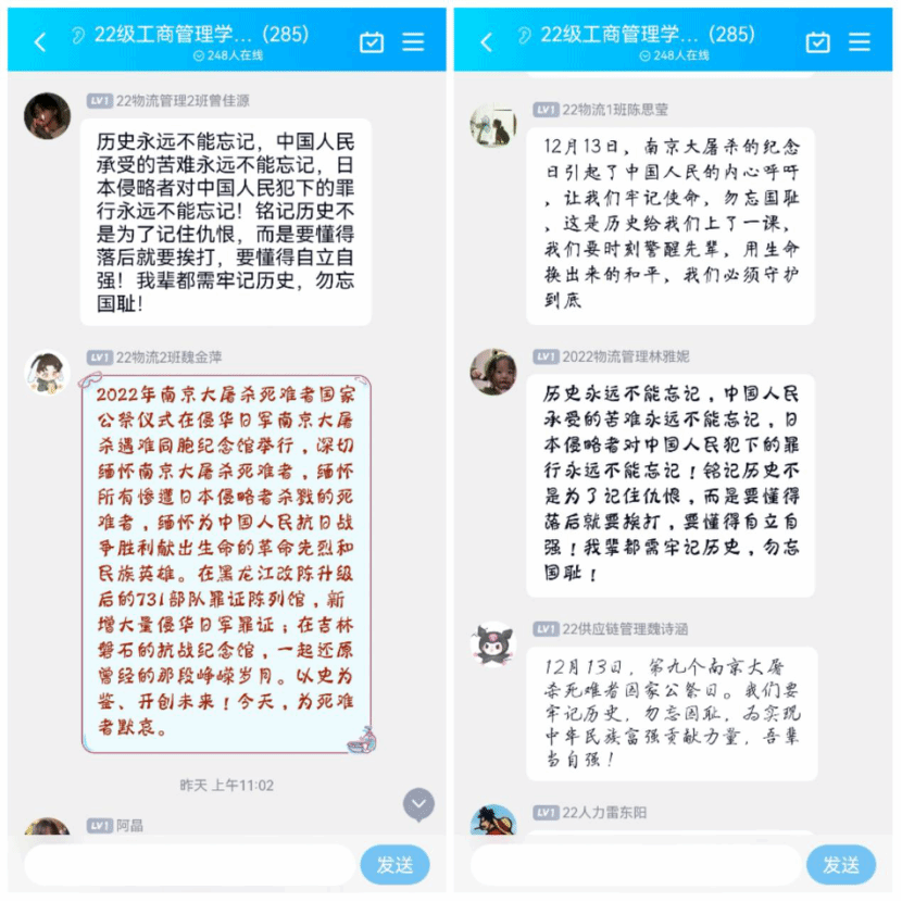 2022年12月13日是第9个南京大屠杀死难者国家公祭日。为深切缅怀南京大屠杀的无辜死难者,缅怀惨遭日本侵略者杀戮的死难同胞,缅怀为中国人民抗日战争胜利献出生命的革命先烈和民族英雄。牢记历史、不忘过去,珍爱和平、开创未来,12月13日,工商管理学院读书社开展“勿忘国耻,珍爱和平”心声寄语纪念活动。