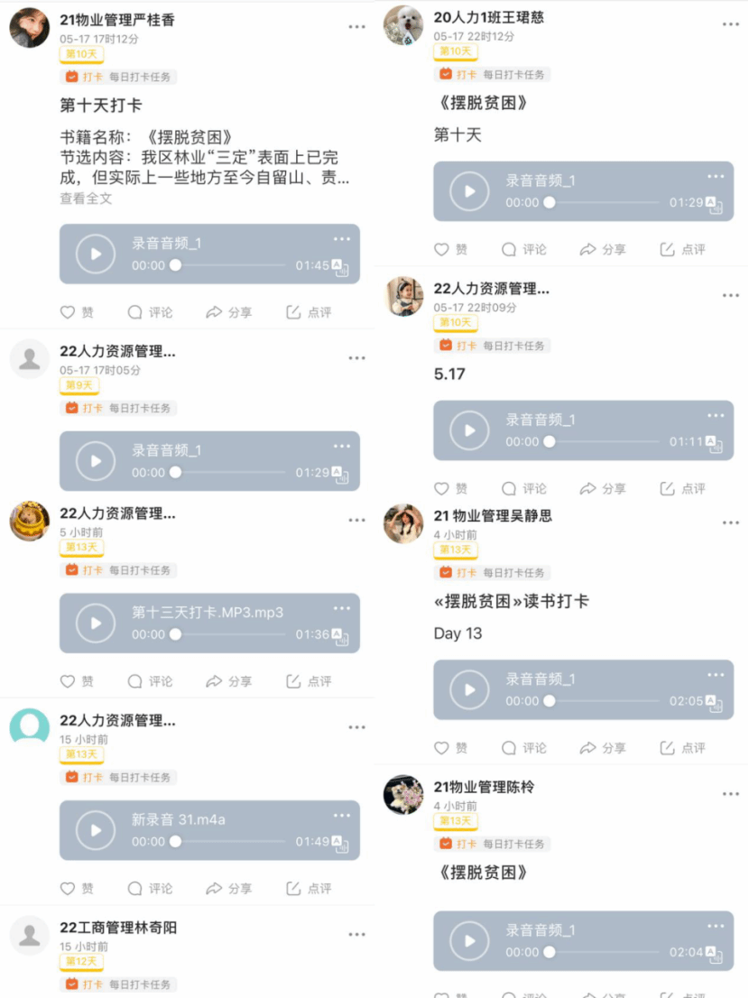 本次活动同学们通过填写活动报名表报名,根据线上诵读打卡活动群所分享的朗诵内容,在微信“小打卡”小程序上进行为期14天的阅读打卡。本期阅读打卡活动主要围绕《摆脱贫困》一书展开学习与讨论,引领广大同学深刻体会本书中所蕴含的重要理念、宝贵经验、优良作风。参与此次活动的同学们纷纷表示,要把学习《摆脱贫困》这本书与学思践悟习近平新时代中国特色社会主义思想有机结合起来,不断从中汲取智慧和力量,奋力谱写全面建设社会主义现代化国家新篇章。