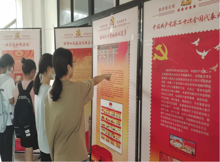 小小的邮票是中国发展的缩影,小小的邮票承载着红色的记忆。邮票虽小,内涵却丰富,通过多样的表现方式将不同元素有机结合,使邮票画面形成和谐的整体,辅以背景故事介绍,让参观者更能领悟邮票背后的红色意义。大家在邮票展上激情讨论,两个不同的场地,但是大家热烈的思想却是一致的。思想的火炬,照耀新时代;坚强的核心,领航新征程。党的二十大是在全党全国各族人民迈上全面建设社会主义现代化国家新征程、向第二个百年奋斗目标进军的关键时刻召开的一次十分重要的大会。学习贯彻习近平新时代中国特色社会主义思想是统一全党思想意志行动、始终保持党的强大凝聚力、战斗力的必然要求。通过邮票展的方式,大大提高了同学们全面贯彻党的二十大精神、深入开展学习贯彻习近平新时代中国特色社会主义思想主题教育。