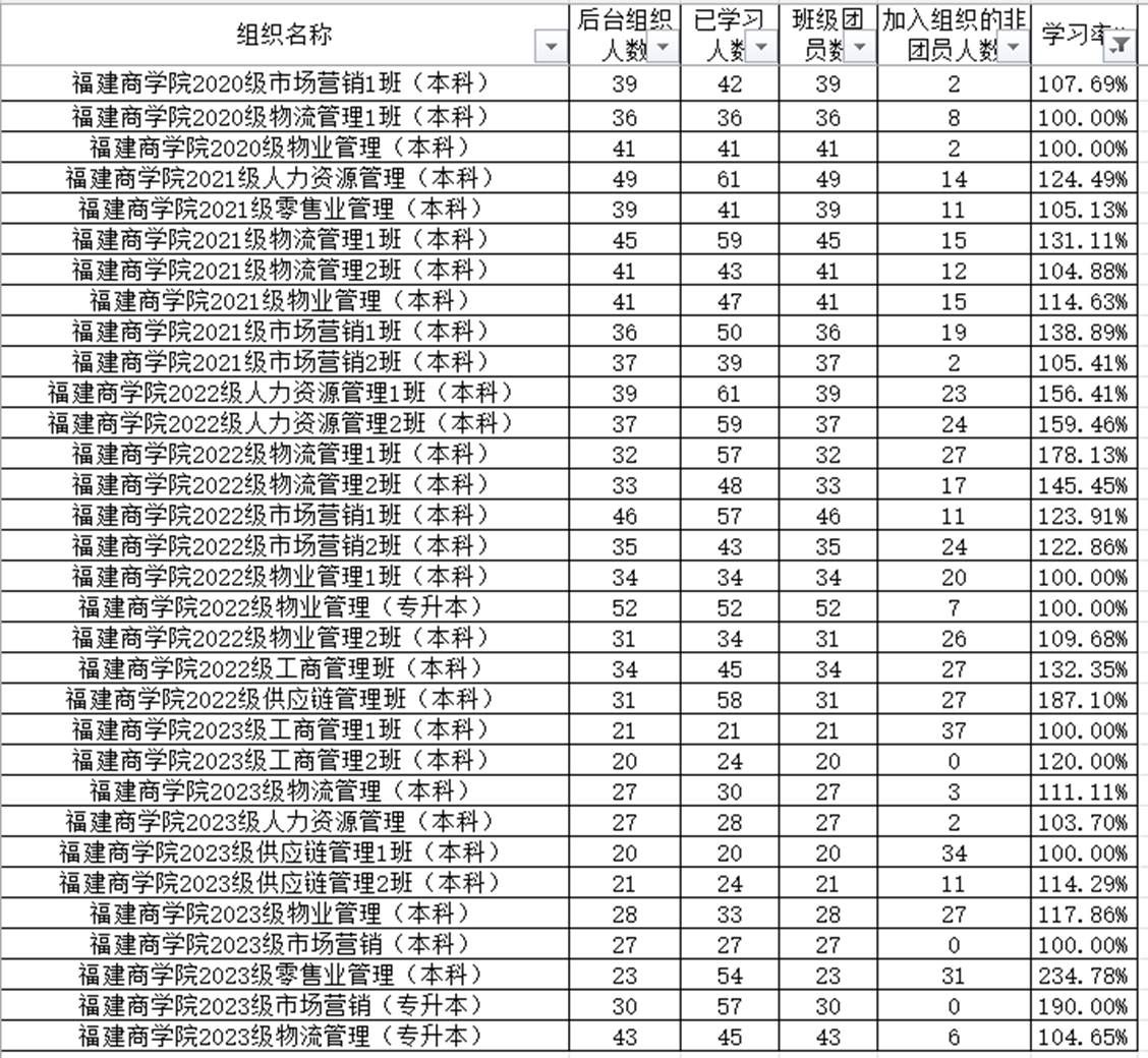 上一期青年大学习中,2020级市场营销1班,2020级物流管理1班,2021级人力资源管理,2021级零售业管理,2022级人力资源管理1班,2022级人力资源管理2班,2023级工商管理1班,2023级工商管理2班等32个团支部完成率达到100%及以上,特在此提出表扬,希望能够继续保持!