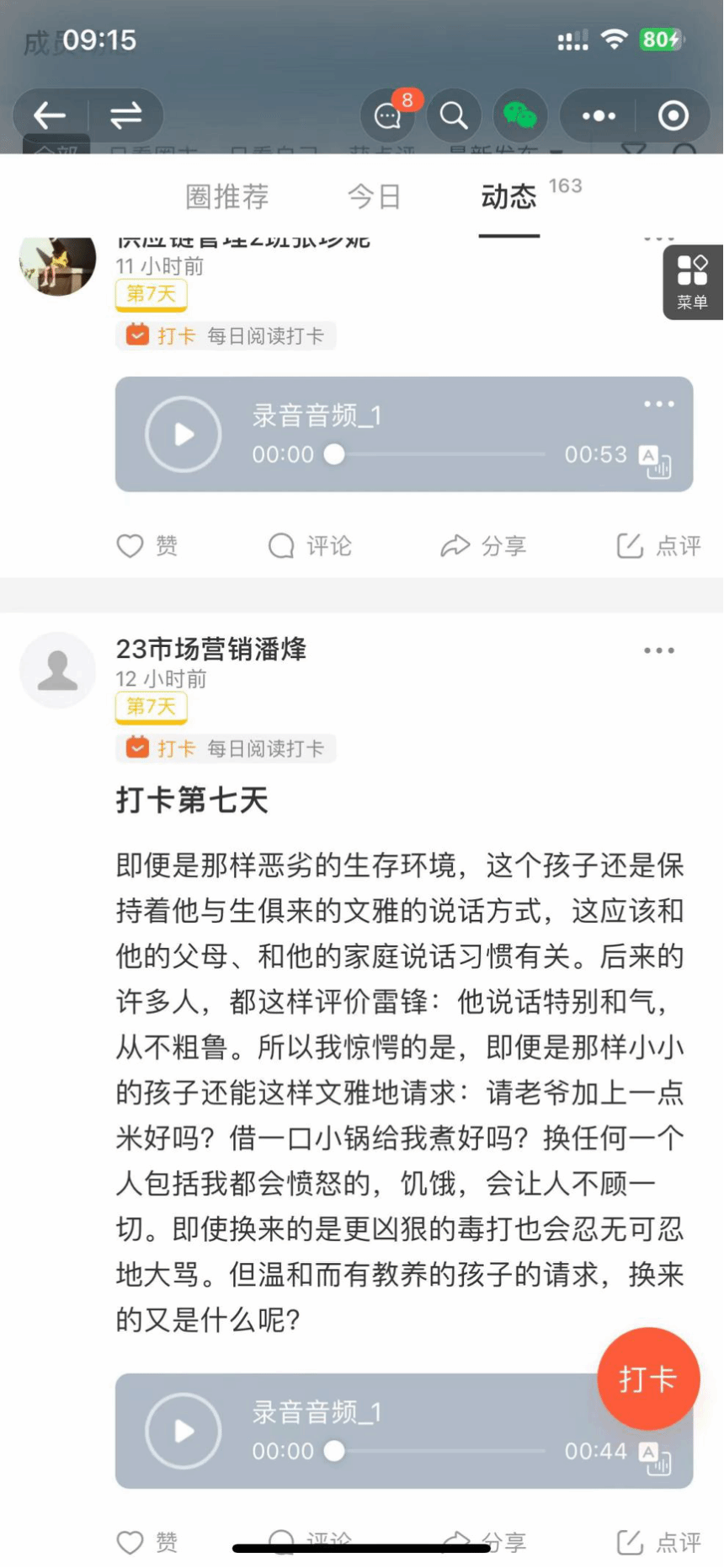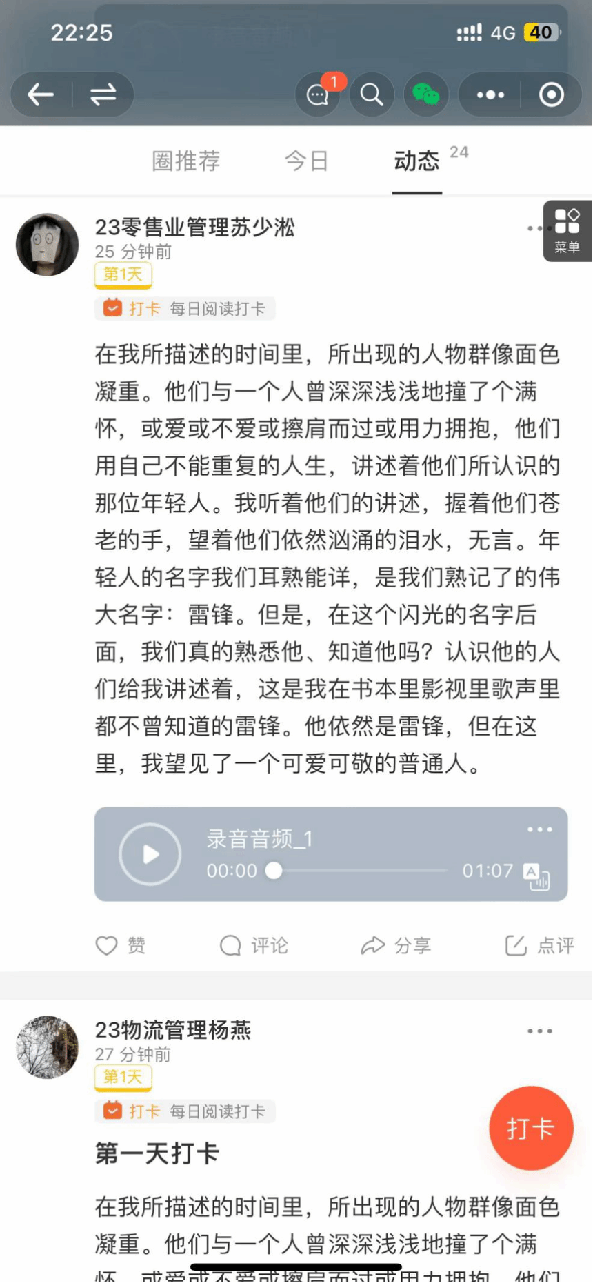 3月4日,为引导同学们养成良好读书习惯,同时深刻学习雷锋精神,传承优良作风,beat365英国官方网站读书社于线上举办为期7天的“传承优良作风,争做时代新人”诵读打卡活动,2023级读书社社员参与了本次活动。