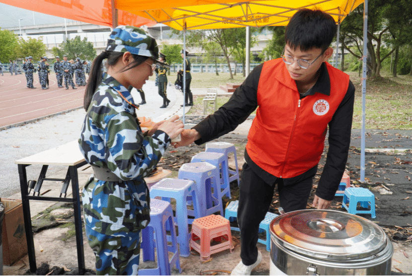 军训期间,志愿者们按时到岗,提供水源补给,时刻关注军训人员的身体状况并及时给予帮助,处理突发情况,为正在军训的同学们“保驾护航”。