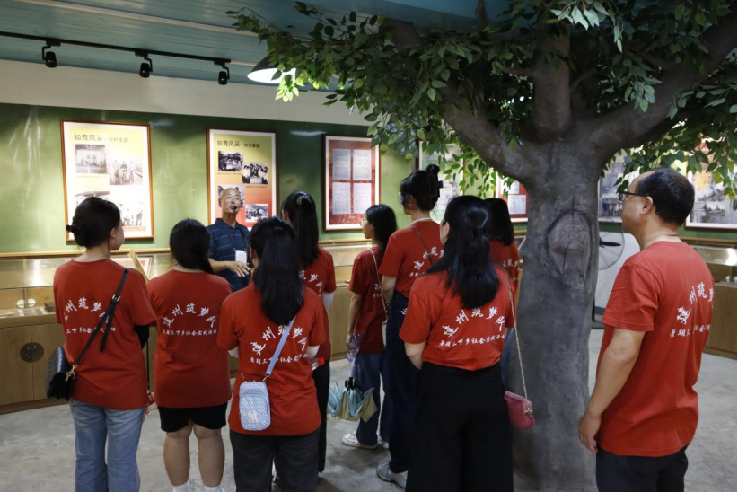 紧接着实践队参观了建瓯红色文化基地——知青博物馆,在穆墩村老书记薛由文的介绍下深入体会知青岁月,了解当年盛况空前的知青上山下乡运动。从知青陈列馆中实践队能清晰的感受到当年知青们农业劳作的艰苦与不易。陈列在橱窗的朴实农具与现代农业技术对比,实践队能够明确认识到建瓯农业的发展历程。而从改造过的农具中也可以看出,早在当年知青们就认识到农业发展的必要性和重要性。而建瓯人也在农业活动中一代代传承知青当年艰苦创业、执着进取的精神,不断推动建瓯当地的农业发展,促进农业现代化,推进农业生活服务规模经营。作为青年一代,观看和倾听完知青在艰苦环境下奋发图强的精神,实践队与讲解员老书记薛由文进行了座谈会,探讨知青文化内涵,并对知青馆的发展提出自己的想法和建议。