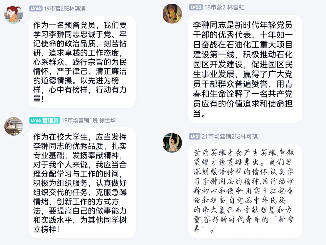 “7.1建党节,我们在行动”线上分享活动 7月1日,支部组织全体党员和入党积极分子通过线上的方式分享七一建党节的图片、视频,抒发自己对党的热切情感,加深了解党的历史,领悟党的精神。同时支部通过线下领誓、线上直播共同结合的方式组织全体党员重温入党誓词。“以榜样为镜、践初心使命”李翀同志先进事迹专题学习会 7月1日,支部开展“以榜样为镜、践初心使命”李翀同志先进事迹线上专题学习会,组织全体党员向李翀同志学习,学习李翀同志忠诚于党、牢记使命的政治品质,学习他刻苦钻研、追求卓越,学习他心系群众、践行宗旨的为民情怀,学习他严以律己、清正廉洁的道德情操,扎实专业基础,发扬奉献精神,认真做好组织交代的任务,克服急躁情绪,提高自己的做事能力和实践水平。