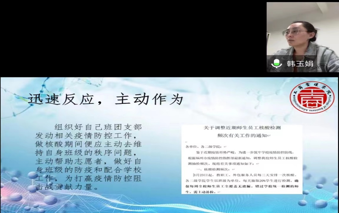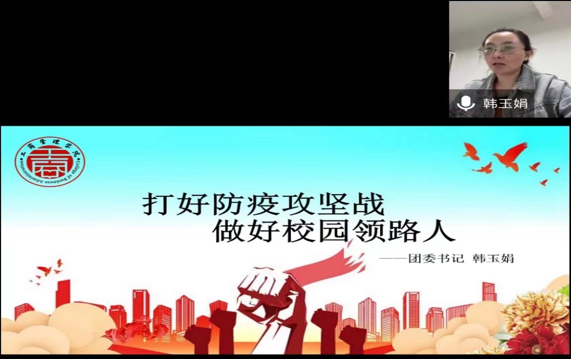 面对严峻的疫情形势,为了让广大团员青年积极配合学校的防疫工作,主动投身于校园防疫工作,强化作为党的助手和后备军的责任意识。beat365英国官方网站于2022年4月5日开展“打好防疫攻坚战,做好校园领路人”线上思政课,团委书记韩玉娟为主讲老师。