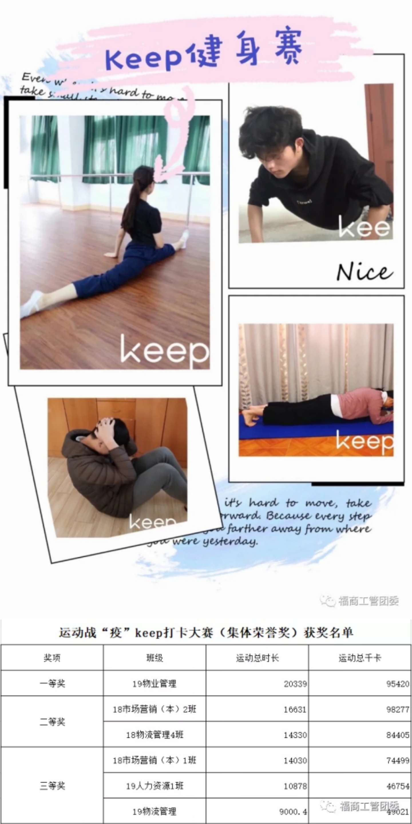 本次活动充分调动了学院学子对健身运动的参与热情和积极性,使学生在参与活动中,感受到运动的快乐,意识到健身锻炼的重要意义,从而培养长期运动的良好习惯,进一步在全学院营造“全民健身,有益身心,增强体魄,促进发展”的良好氛围。“没有机会看见这春天的人,给了无数人拥抱春天的机会”,为了进一步贯彻习近平总书记关于新冠肺炎疫情防控的重要讲话和落实福建商学院的体育运动精神,让福商学子们以更加昂扬的斗志,更加健壮的体魄,持续健康地投入疫情斗争和学习任务中去,beat365英国官方网站开展了“运动战‘疫’工管在行动”Keep打卡健身活动。