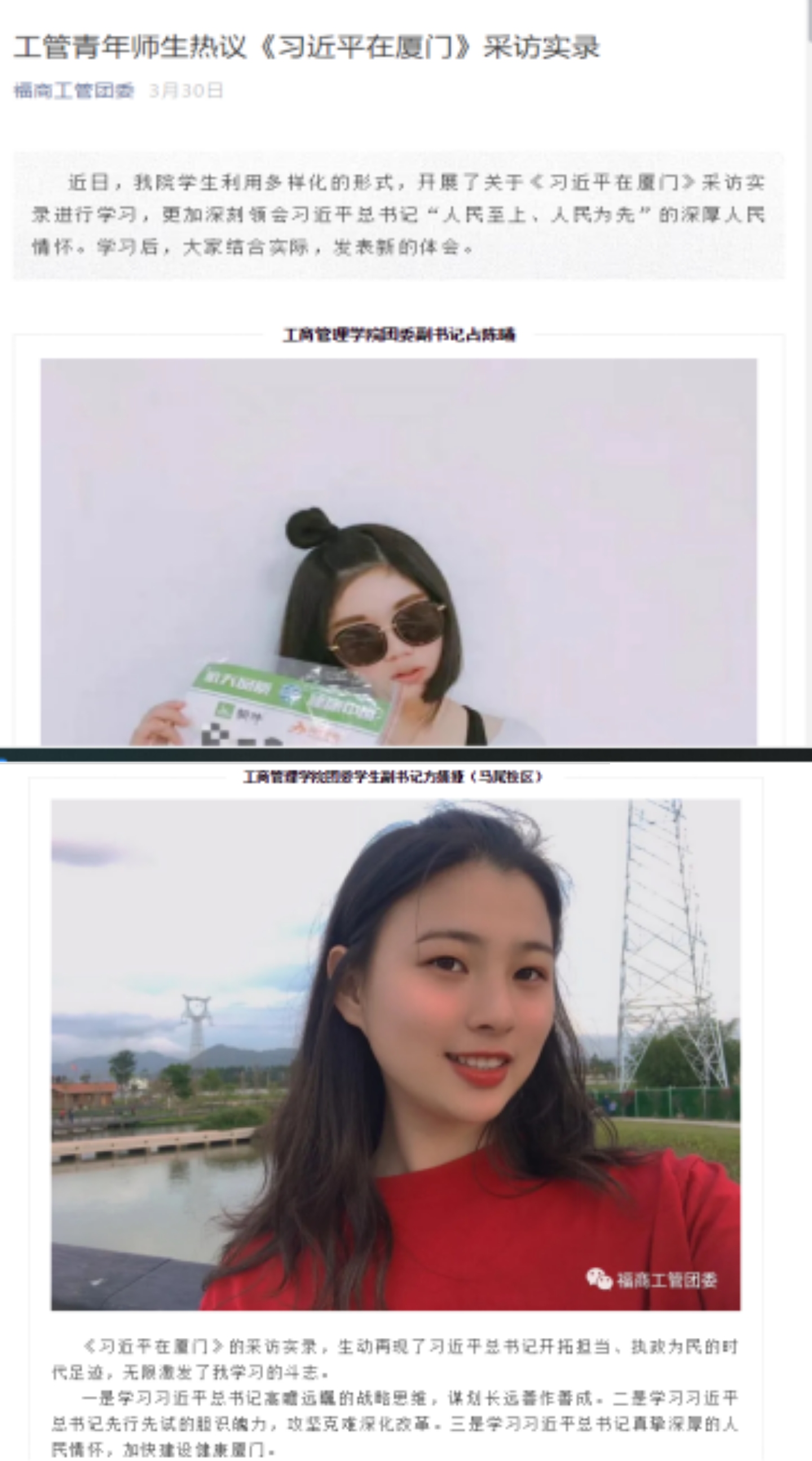 《习近平在厦门》采访实录深刻体现了总书记“人民至上、人民为先”的深厚情怀,各团支部结合大学生实际,深刻领悟了习近平总书记着眼长远、胸怀大局的战略思维,大刀阔斧、科学决策的改革思路,脚踏实地、严谨务实的工作作风,心系人民、情暖民心的赤诚情怀,进一步深化了对习近平新时代中国特色社会主义思想理论逻辑和实践逻辑的理解和把握,纷纷表示要在总书记的指引下,完成好新时代青年的历史使命与历史责任。