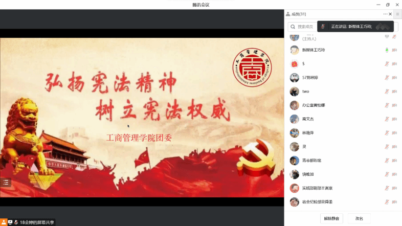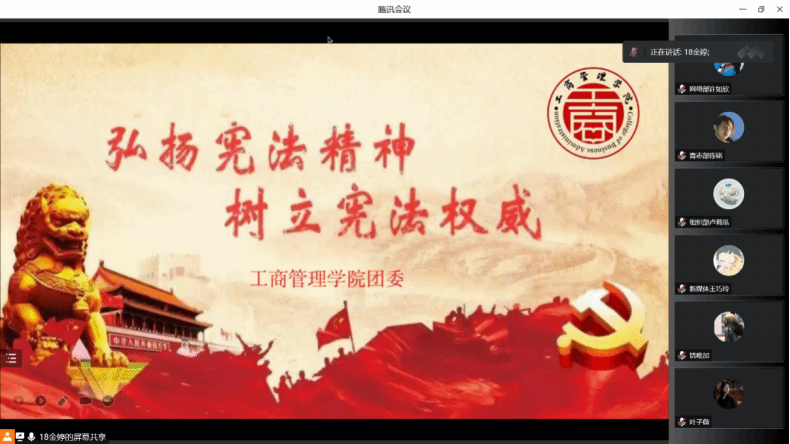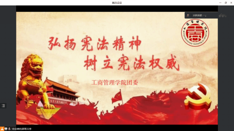 为全面贯彻习近平法治思想,大力弘扬宪法精神,引导学生树立良好的宪政意识,beat365英国官方网站于2022年12月19日开展“学习宪法精神”线上主题分享会,由beat365英国官方网站学生干部分享学习宪法精神的心得,并由学生会主席金婷主持会议。